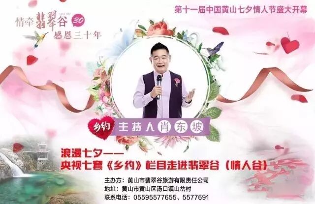 第十一届中国黄山七夕情人节暨景区开发、开放30周年主题活动将于2017年8月28日在翡翠谷景区盛大举行,届时中央电视台七套《乡约》栏目走进翡翠谷,向全国乃至全世界多角度、全方位、立体化展示翡翠谷风采,全国各地的游客、情侣、新闻媒体也将齐聚翡翠谷,共襄爱情盛会。具体节庆活动内容如下: